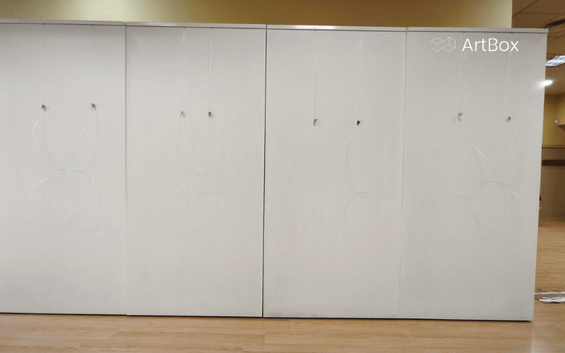 ✅ El resultado final: Los muros ya terminados incorporan: Un sistema ergonómico y móvil gracias a sus ruedas. Sistemas de colgado para cuadros, adaptables a cualquier tipo de obra bidimensional.